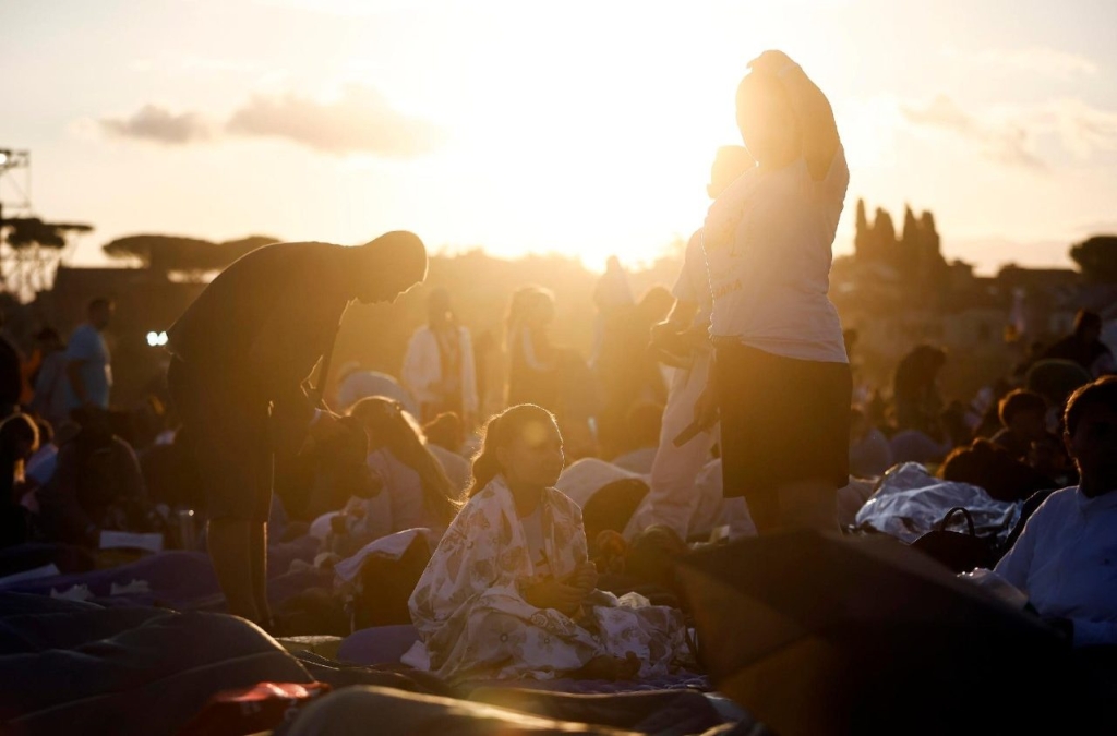 Pasan las horas, llega el amanecer: el sol anuncia su llegada en la explanada de Tor Vergata y se prepara para acariciar a los jóvenes que poco a poco, uno tras otro, comienzan a abrir los ojos al nuevo día. Hay quienes durmieron poco o nada y salen de la tienda con dificultad para mantener los ojos abiertos, quienes se levantan del saco de dormir como si fueran una momia volviendo a la vida. Hay quienes aún intentan arrancar unos minutos de sueño, sentados en el suelo o en una silla, antes de levantarse, y quienes ya de pie vuelven de los servicios o, en un rincón, se están lavando los dientes y la cara para afrontar el día.