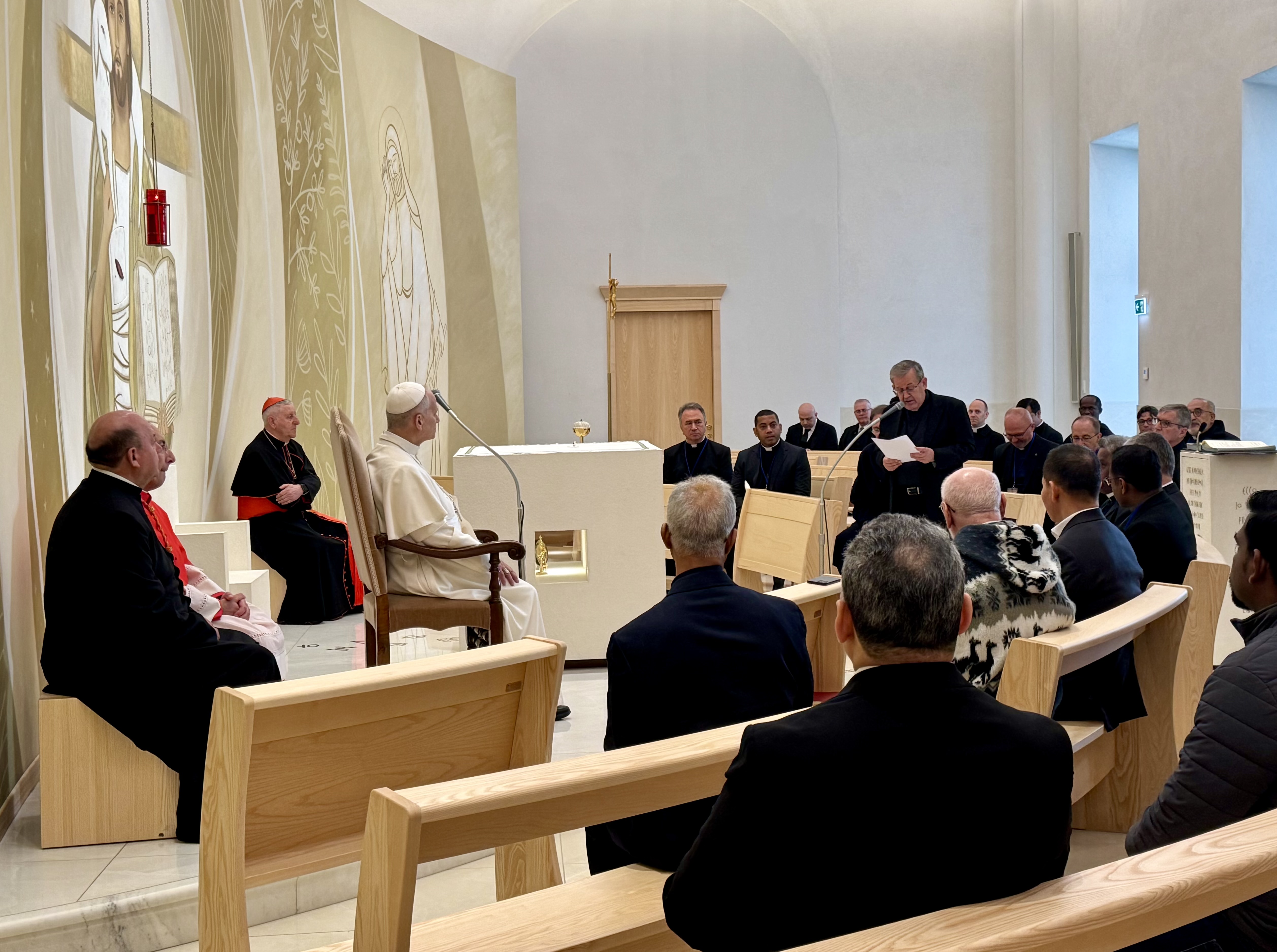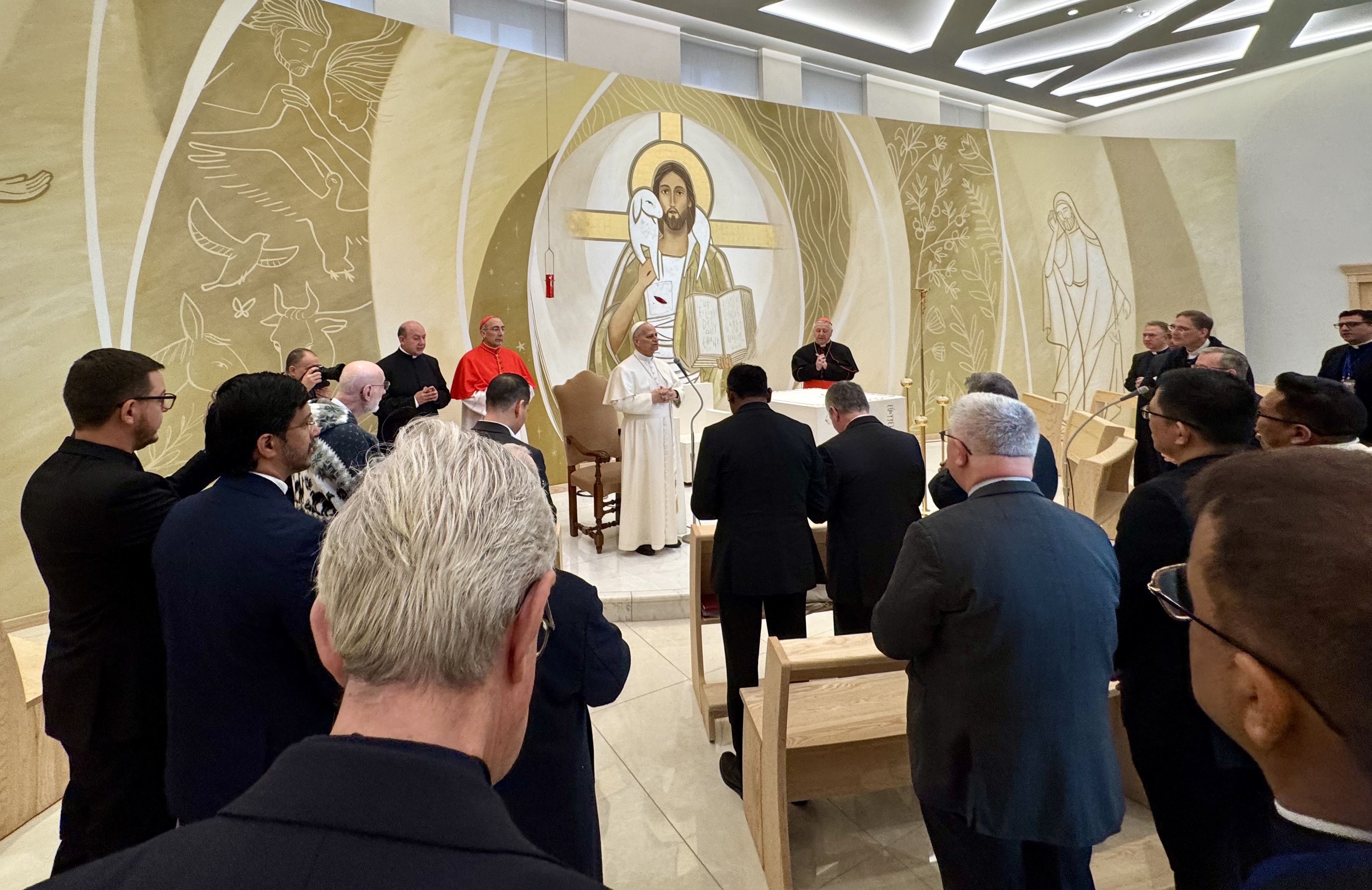 En su intervención, el papa León XIV quiso iniciar con las palabras del Evangelio de Juan (20,30-31), inscritas sobre el ambón de la capilla: "Jesús, en presencia de sus discípulos, hizo muchos otros signos que no han sido escritos en este libro… estos han sido escritos para que creáis".