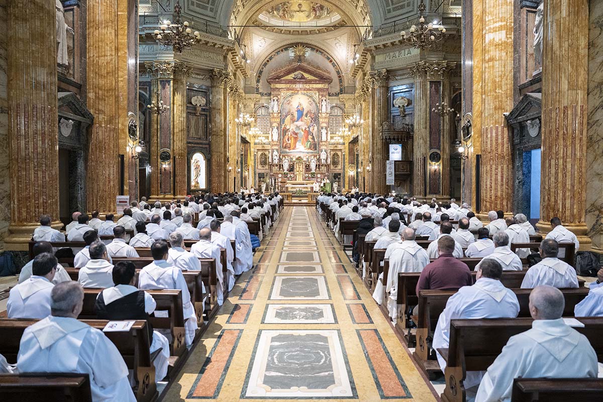03. Turín, Italia – 16 de abril de 2025 – Los capitulares en oración en la Basílica de María Auxiliadora en Valdocco.