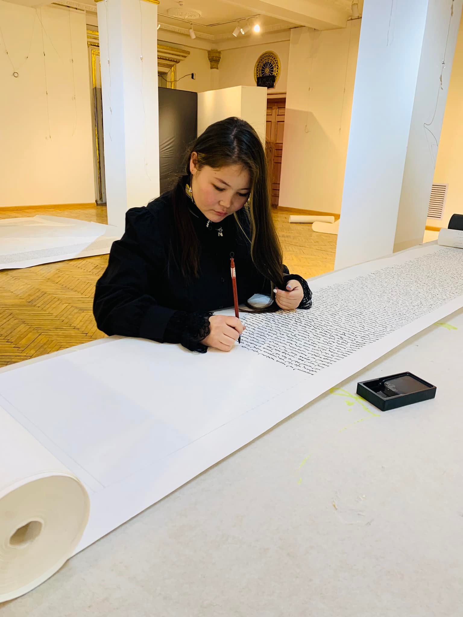 Così, dopo aver completato il lavoro con tutti gli altri 80 insegnanti, ora sono molto orgogliosa di me. La Storia Segreta della Mongolia è stata scritta in 3 forme: in una pergamena lunga 60 metri - il risultato più spettacolare - poi un pannello a muro di 3,2 x 4 metri e infine un ampio tomo di 50 pagine.