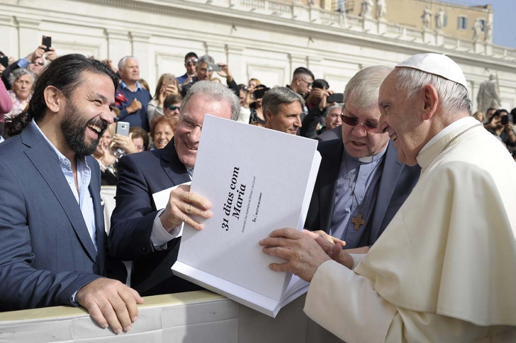 Città del Vaticano, Vaticano – ottobre 2017 – In relazione al Centenario delle Apparizioni della Madonna di Fatima, il Bollettino Salesiano del Portogallo ha realizzato una collezione di 31 acquarelli originali che sono stati donati a Papa Francesco. La collezione è il risultato della newsletter “31 giorni con Maria”, che durante il mese di maggio ha unito migliaia di fedeli nella celebrazione del centenario. Il diacono Joaquim Antunes, direttore del Bollettino Salesiano del Portogallo, don Artur Pereira, già Ispettore del Portogallo e Nuno Quaresma, autore degli acquarelli, hanno consegnato la raccolta al Santo Padre, in occasione dell’udienza generale del 18 ottobre.