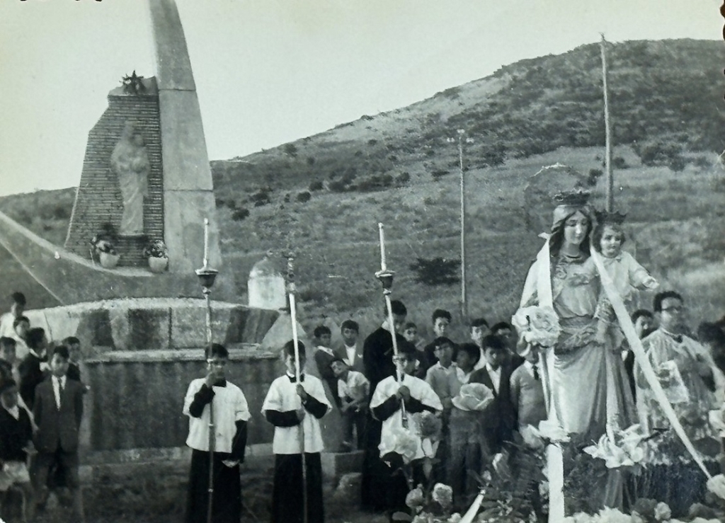 Puertollano, Espanha – Anos ‘60s – A foto - parte do acervo histórico dos Salesianos de Puertollano, documenta uma celebração em honra de Maria Auxiliadora, possivelmente ocorrida em maio da década de 1960, na propriedade denominada El Bonal, situada na periferia da cidade. Na época, a zona rural sediava um seminário (aspirantado salesiano), aprovado pela Diocese local, graças à benevolência da proprietária do terreno, Doña Concepción Narváez Ulloa, Marquesa viúva de Álava e Viscondessa de Casa Blanca. Ela permitiu que a propriedade fosse utilizada para a missão educativo-vocacional dos Salesianos de Dom Bosco. - A foto provavelmente capta o momento da procissão em honra de Maria Auxiliadora, da qual participavam os jovens aspirantes e a Comunidade Salesiana. Em destaque, ao fundo, o Monumento a Maria Auxiliadora, obra do escultor salesiano P. Enrique Herencia. Até a saída dos salesianos da propriedade, na década de 1970, El Bonal teve um papel importante na vida de várias gerações de jovens; e o Monumento se mantém preservado, devido ao respeito que a comunidade local dedica a Maria e ao testemunho silencioso da presença salesiana na Região.