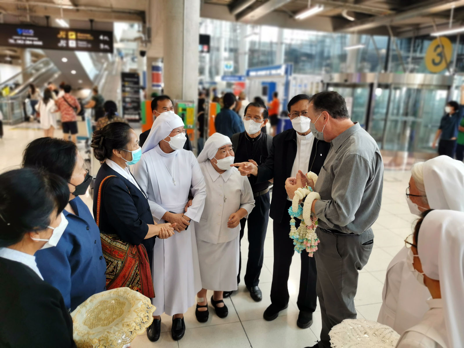 Ao desembarcar, recebeu as calorosas boas-vindas do P. Joseph Nguyen Thinh Phuoc, Conselheiro para a Região Ásia Leste-Oceânia, do P. John Bosco Dheparat Pitisant, Inspetor da Tailândia (THA), e de vários representantes da Família Salesiana do país. A comissão de boas-vindas precisou ser limitada devido aos protocolos sanitários ainda em vigor por causa da pandemia de Covid-19 – embora o número de casos esteja a diminuir – ; e os que puderam ir, ficaram radiantes pela oportunidade de conhecer o P. Ángel Fernández Artime, “presença de Dom Bosco entre nós”, conforme disseram.