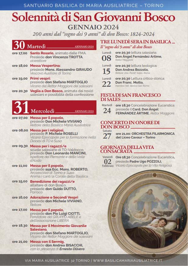 As celebrações entrarão em pleno andamento na terça-feira, 30 de janeiro. Começarão às 17h com a oração do Terço, animada pelas Filhas de Maria Auxiliadora e presidida pelo P. Vincenzo Trotta, Vice-Reitor da Basílica. Às 18h, haverá a Missa Véspertina, pelo Sr. Bispo Auxiliar de Turim, Dom Alessandro Giraudo. À noite, a partir das 19h, o P. Stefano Martoglio, Vigário do Reitor-Mor, presidirá as Primeiras Vésperas, seguidas que serão pela Vigília de Dom Bosco, animada pelos noviços salesianos, durante a qual, haverá a oportunidade de Confissões.