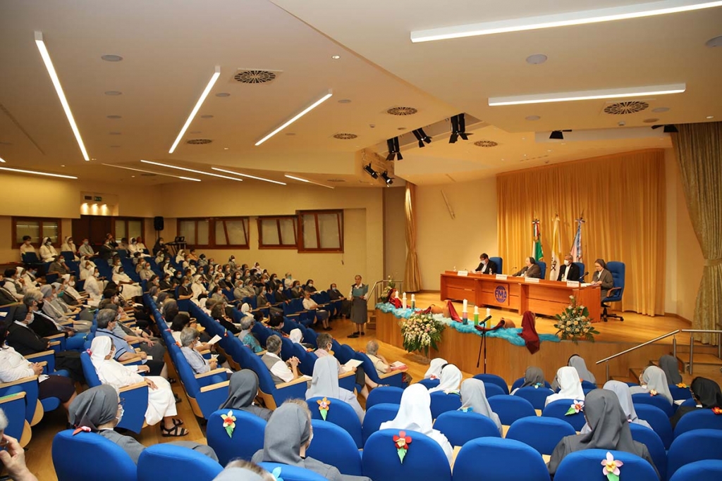 Il momento celebrativo ha quindi preso il via con l’ingresso delle Bandiere dei 97 Paesi in cui l’Istituto FMA è attualmente presente. Quindi Madre Reungoat, nel suo discorso di benvenuto, ha ripercorso il cammino e i processi realizzati per la preparazione al CG, e ha animato le capitolari con queste parole: “La generatività è la missione di Maria che ha voluto, generato e guidato l’Istituto nel corso della sua storia e che a 150 anni dalla fondazione continua a generarlo perché sia, nella Chiesa e nel mondo, ciò che deve essere per e con i giovani… Ci auguriamo di vivere una vera esperienza di incontro fecondo di nuovi germi di vita per ripartire da qui, rigenerate, con passione ed entusiasmo per generare nuova vita nelle nostre comunità e nella missione educativa”.