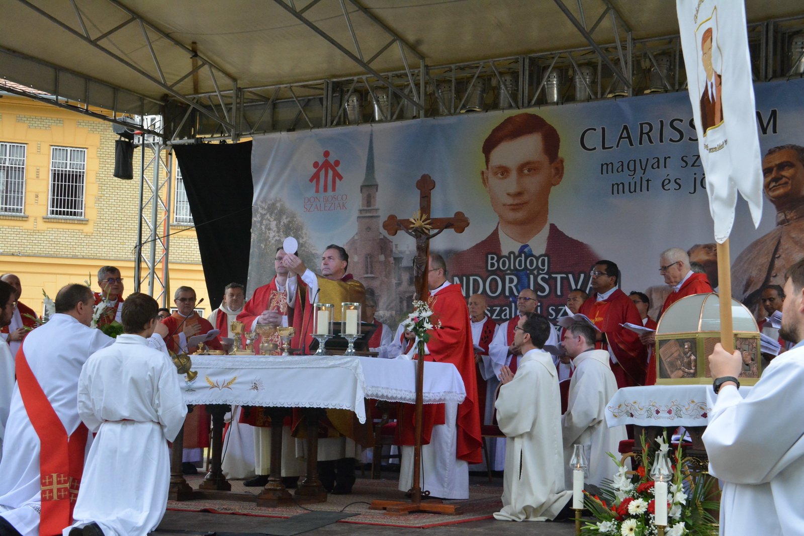 Nell’omelia il Rettor Maggiore ha sottolineato come è Dio che guida la storia e gli eventi anche quando le volontà umane perseguono fini di morte e di ingiustizia: “Il Beato Stefano Sándor torna a casa sua e noi Famiglia Salesiana, amici di Don Bosco, Salesiani di Don Bosco possiamo tornare a un posto, a casa nostra, per continuare a fare il bene… Le reliquie di Stefano Sándor, come quelle di tutti i santi e beati sono come stelle del cielo che rafforzano la nostra fede… Il Reliquiario ha un forte senso simbolico che esprime la vita di Stefano Sándor; in particolare c’è la croce salesiana con il lemma 'Studia di farti amare'. La croce del Signore è più forte di tutte le catene del mondo. Si può fare male a qualche persona, si possono uccidere alcune pensieri, ma non si può mai silenziare Dio; non si può silenziare la bontà di tanta gente che custodisce la fede e il Vangelo. Qui abbiamo la testimonianza di un giovane salesiano coadiutore, di un tipografo che faceva assistenza tra i ragazzi, che insegnava il catechismo, che era un innamorato di Dio e di Don Bosco e la sua vita ha più forza, perchè per noi è modello di vita”.