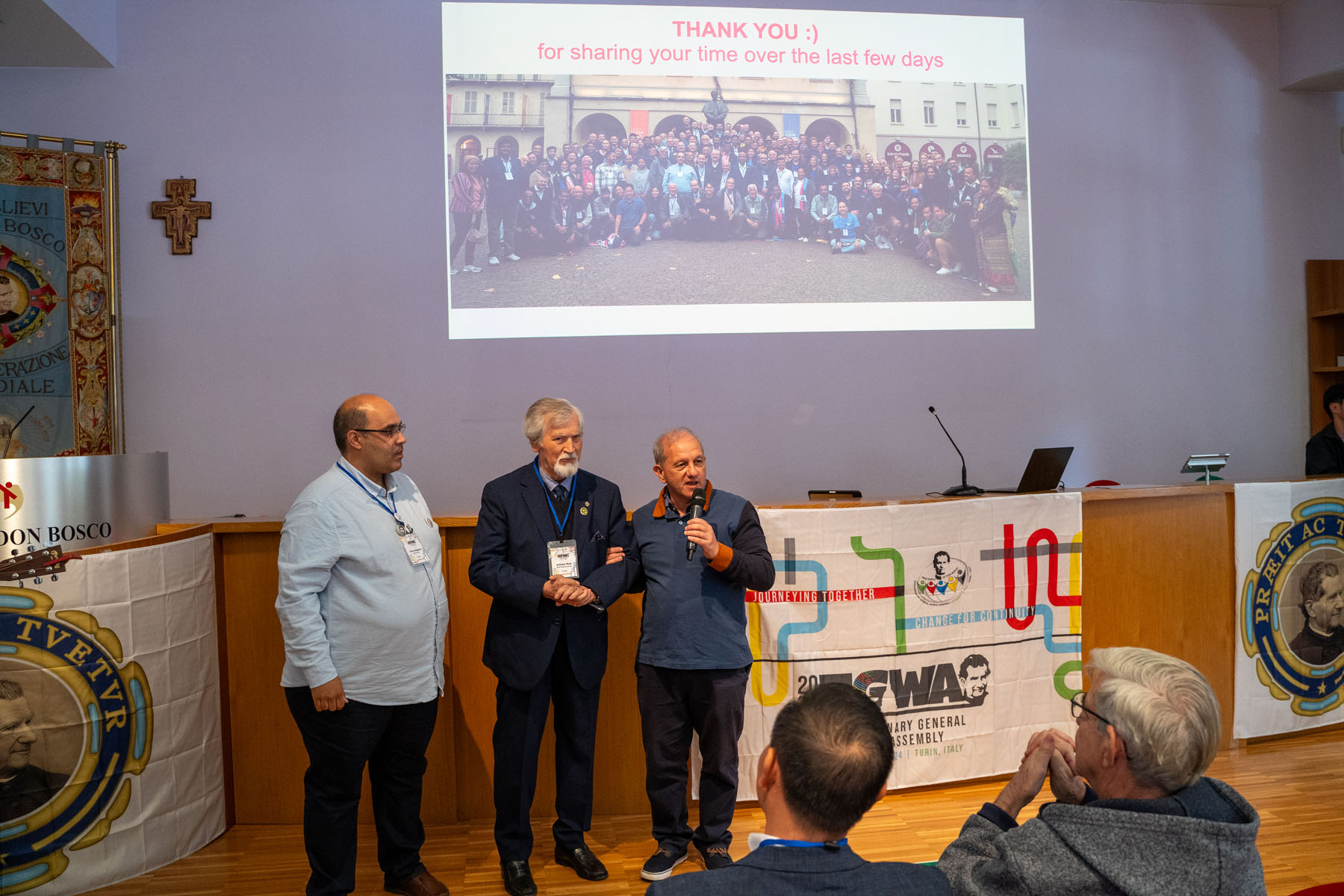Dopo la preghiera conclusiva di don Joan Lluís Playà, Delegato Centrale del Rettor Maggiore per il Segretariato della Famiglia Salesiana, il Presidente Magro ha dichiarato ufficialmente chiusi i lavori dell’Assemblea Generale Straordinaria Mondiale, seguiti poi dalla tradizionale agape fraterna.